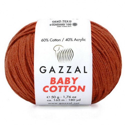 Gazzal Baby Cotton ― дитяча літня пряжа. Складається із 60% бавовни: натурального рослинного волокна, та 40% з поліакрилу.